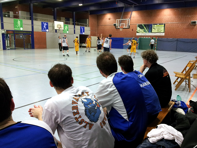 Die anwesenden Fans genossen an diesem Abend prinzipiell vier identische Viertel, mit jeweils recht deutlichem Ausgang für die OLD BOYS, die im Verlaufe der Begegnung munter durchwechselten, so dass gefühlt fast alle möglichen OLD-BOYS-Spielerpermutationen auf dem Feld zu sehen waren. Schnell witterte man die Chance, erstmalig in dieser Ü35-Saison die 100er-Marke zu knacken. Während hierfür die ersten drei Viertel tatsächlich planmäßig verliefen, musste man in der ersten Hälfte des 4. Viertels noch mal sehr bangen, ob es noch einen 100er-Schützen geben würde, und damit eine weitere Getränkekiste auf der Kistenliste (Zusätzlich hatte Thorsten M. im Vorfeld auch noch eine Bonusbox für ein dreistelliges Ergebnis ausgelobt). Es schlichen sich jedoch in dieser Phase schludrige Pässe und Würfe ein, außerdem vergaß man gelegentlich, dass die Seitenlinien in der Lüttkoppel-Arena eben nicht – wie im Eschenweg – direkt an der Hallenwand zu finden sind. Irgendwie rückten die OLD BOYS dann aber doch an die magische Punktegrenze heran, und urplötzlich, Sekunden vor Schluss fand sich Tim bei einem Spielstand von 99:37 an der Freiwurflinie wieder und hatte es und auch den Ball in der Hand. Treffer! 100! Getränkekistenliste verlängert. Es ist nicht überliefert, ob sich die OLD BOYS für seinen zweiten Freiwurf tatsächlich einen Airball gewünscht haben, was zwingend die Kistenliste erneut verlängert hätte.