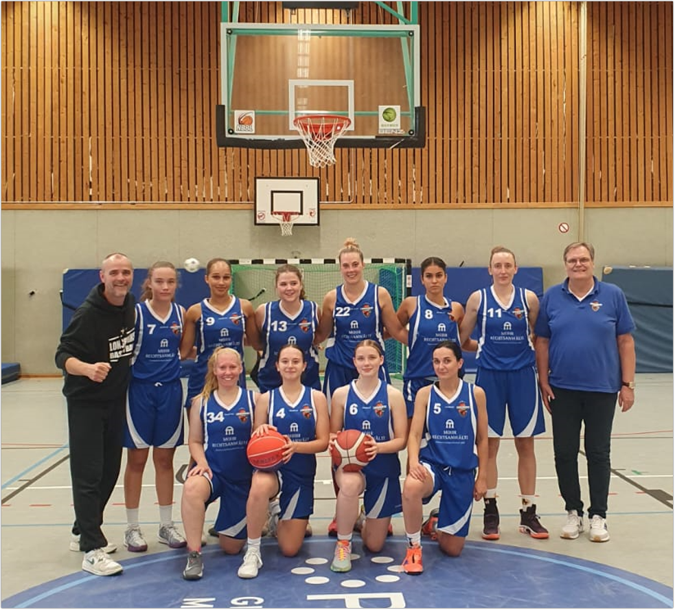 Unsere 1. Damen hatten in der 2. Regionalliga ein echtes Endspiel in Rostock. Vor 1000 (!) Zuschauern wurde in der Rostocker Stadthalle als Vorspiel zur BBL Bundesliga um den Titel und Aufstieg in die 1. Regionalliga Nord gefightet. Und es wurde ein wahrer Fight gegen hochmotivierte Rostock Seawolves, die von der unglaublichen Kulisse angefeuert wurden. Zur Halbzeit stand es 32:42 für SCALA. Im 3. Viertel kamen die Seawolves noch einmal auf 43:46 heran. Das SCALA Team, eine Mischung aus jung und etwas älter, behielt die Nerven und zog kontinuierlich davon. Am Ende stand ein unglaubliches 58:80 am Würfel der Hallendecke und der Aufstieg war perfekt. Die Coaches Jens Holtkötter und Daniel Brants wurden noch am Spielfeldrand „geduscht“ und der Rest war Feiern.